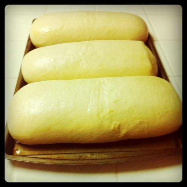 First defrost your frozen loaves of Bridgestone bread. This needs to be started the night before you plan on preparing your pepperoni bread. Pull the loaves out of the packaging, rub them in either olive oil or cooking spray and place on a greased cookie sheet. I typically cover them with saran and put them in the refrigerator overnight., then pull them out to rise at room temperature for at least an hour before I get ready to roll them out. They should be fluffy and at least twice their frozen size before you roll them out flat.