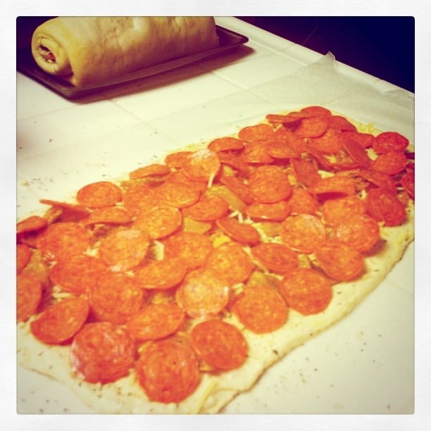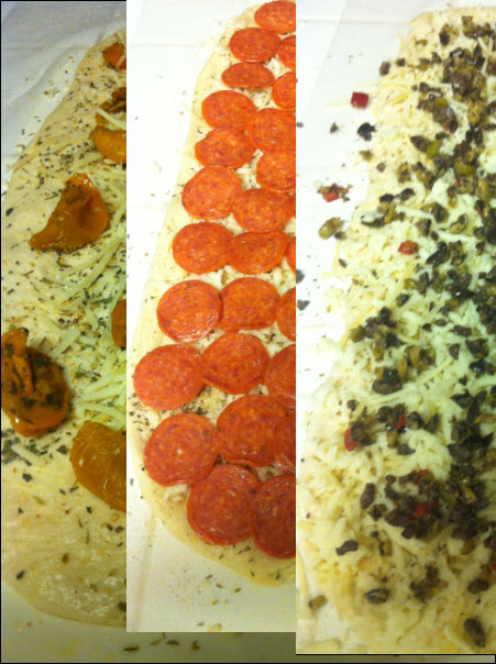 I did pepperoni on all 3 of mine, but added sun-dried yellow tomatoes to one, and olive tapenade to another. These both turned out to be great additions, but be forewarned if you use a topping like one of the above that is soaked or stored in olive oil- try and soak up as much of the oil as you can in advance of adding it to the bread, as the pepperoni creates plenty of grease on its own!