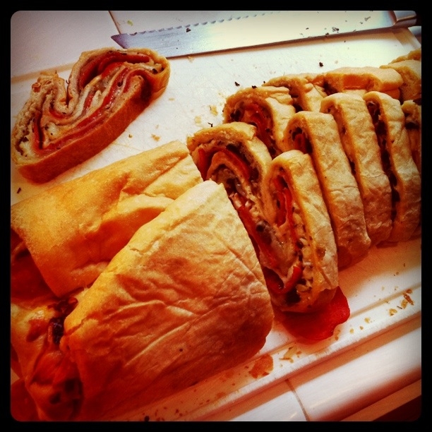 When you’ve added toppings to your heart’s content roll that sucker up as tightly as you can and place it, seam-side down, back on your greased cookie sheet.