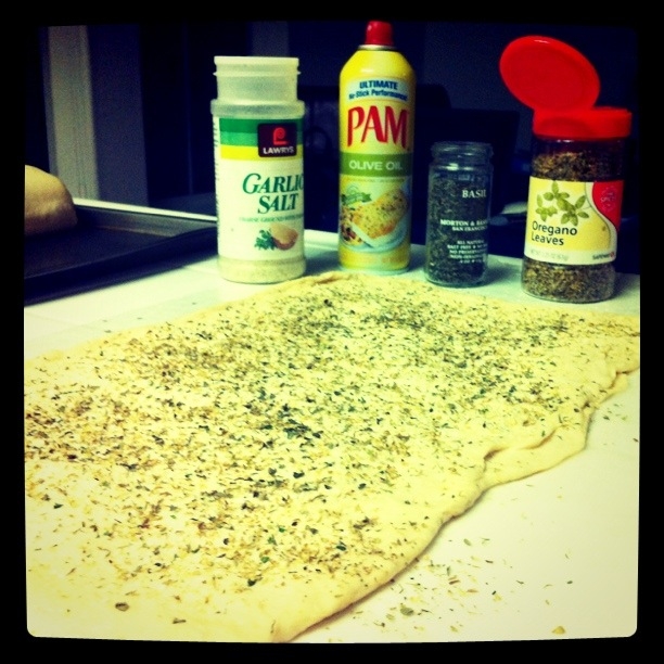 Sprinkle your garlic salt all over the flattened bread, then the oregano and then the basil.